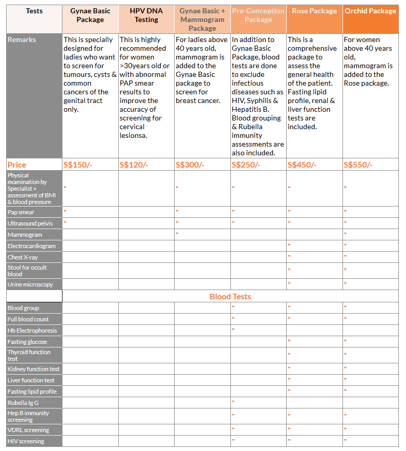 Our Centre understands the growing health concerns of modern women. It is not enough to detect and treat diseases; women would like to know more about their health status and prevention of common diseases. It is with this in mind that we roll out the following health packages to suit the needs of women at different stages of their lives.